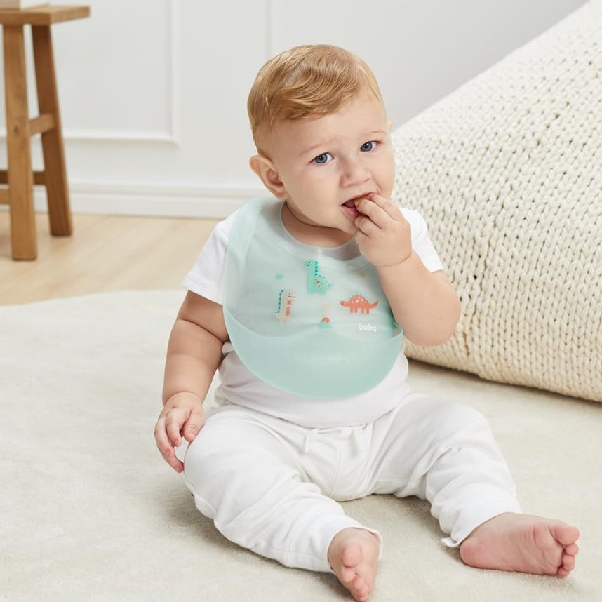 O Babador Buba Magic Dino traz um design lúdico com dinossauros e animais que encantam os pequenos, tornando a alimentação mais leve e divertida.