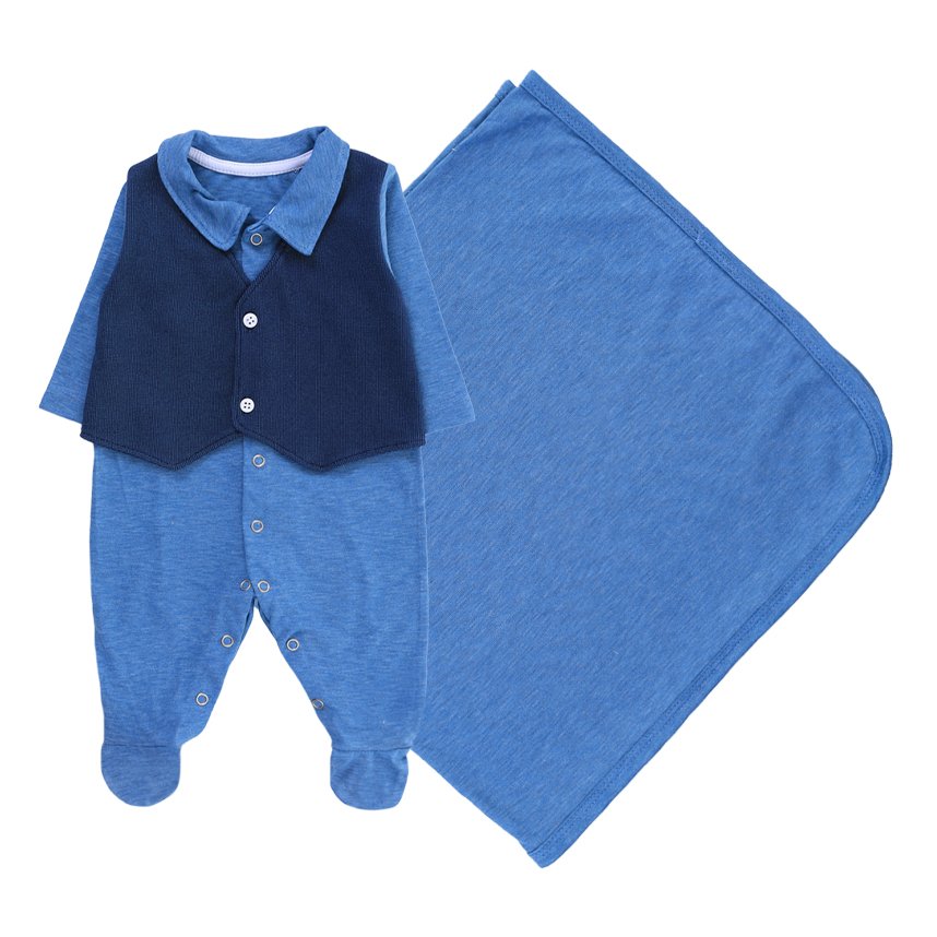 O macacão traz um lindo visual de colete estampado, com botões decorativos frontais que deixam a peça ainda mais charmosa. Possui gola, mangas longas e abertura por botões de pressão, facilitando vestir e trocar o bebê. A manta acompanha o mesmo padrão do tecido, garantindo um conjunto elegante e harmonioso.